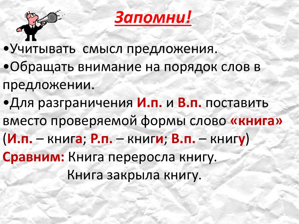 (И.п. – книга; Р.п. – книги; В.п. – книгу)