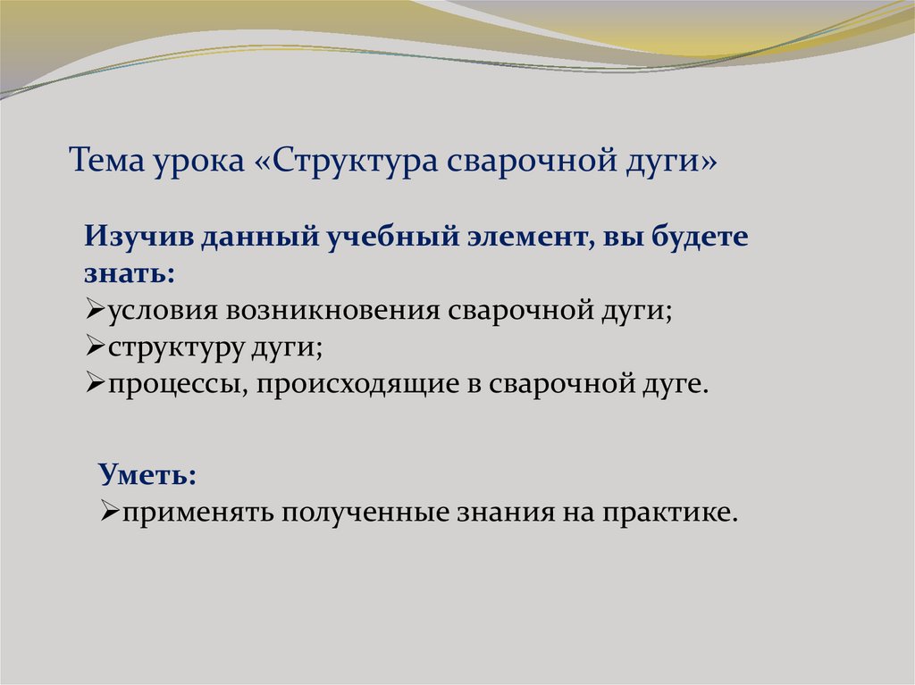 Тема урока «Структура сварочной дуги»Изучив данный учебный элемент, вы будете