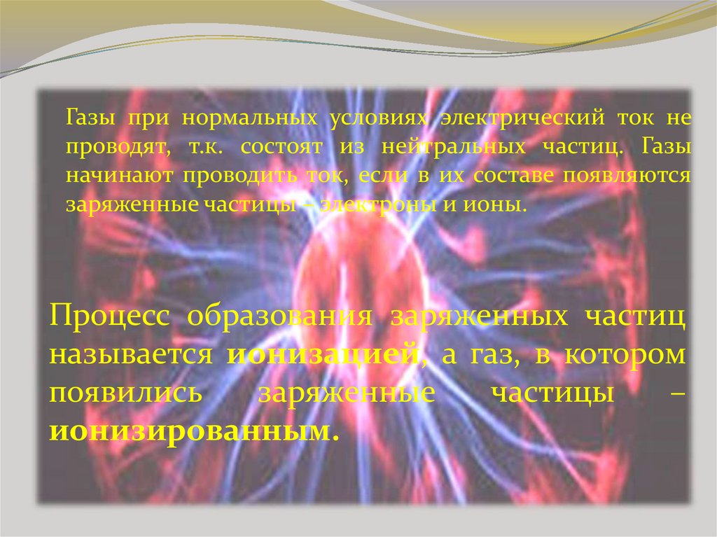 Газы при нормальных условиях электрический ток непроводят, т.к. состоят из нейтральных частиц. Газы