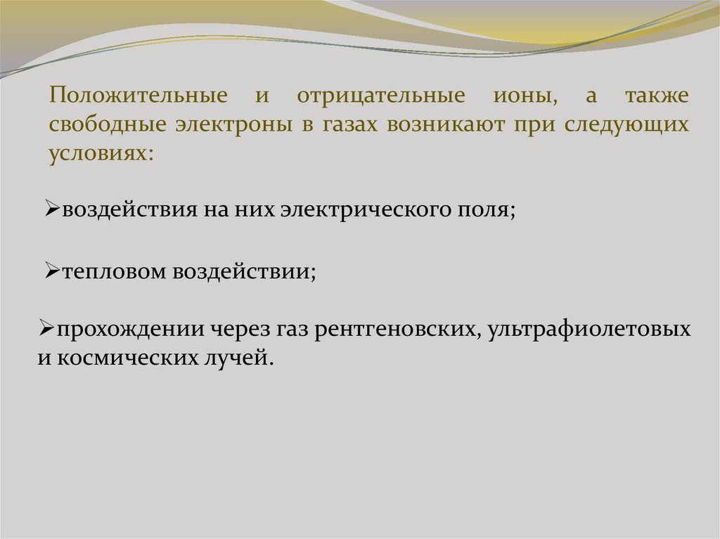 Положительные и отрицательные ионы, а такжесвободные электроны в газах возникают при следующих