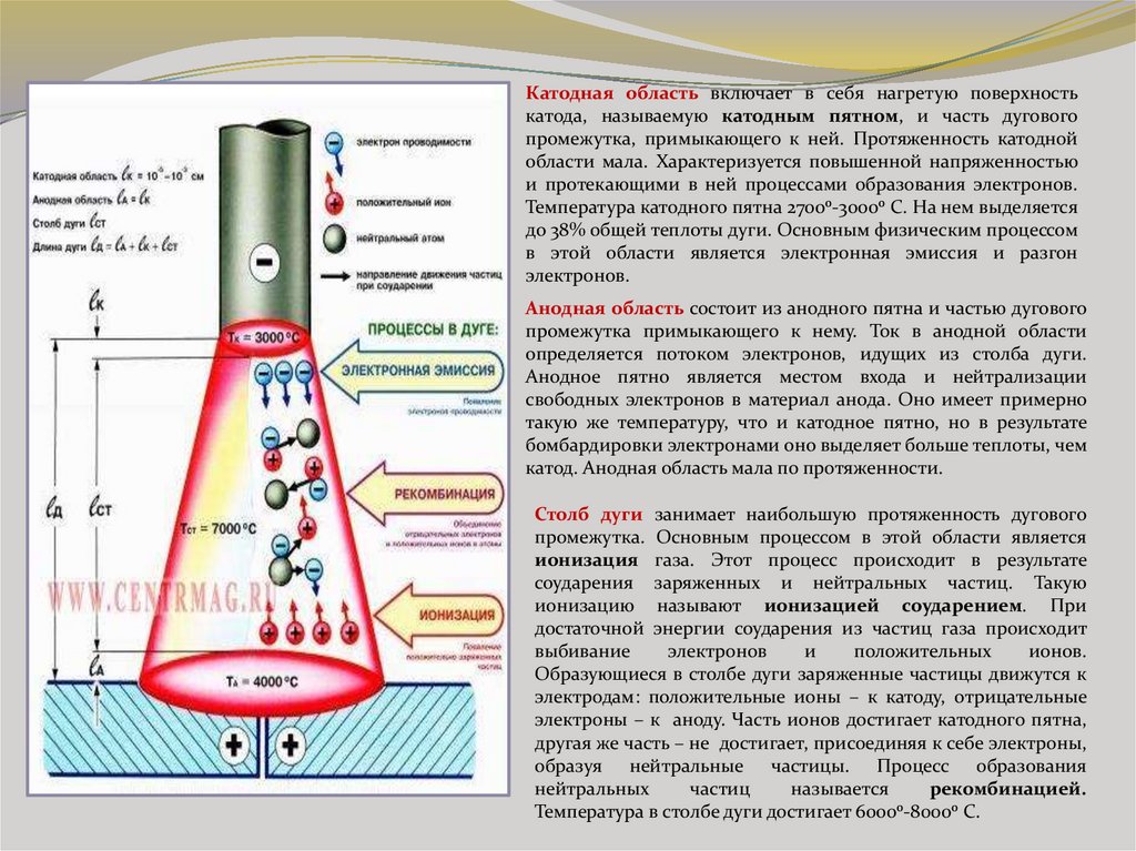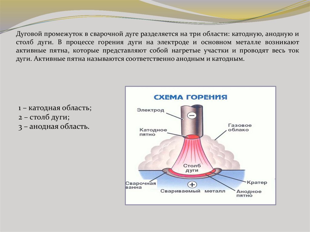 Дуговой промежуток в сварочной дуге разделяется на три области: катодную, анодную истолб дуги. В процессе горения дуги на электроде и основном металле возникают