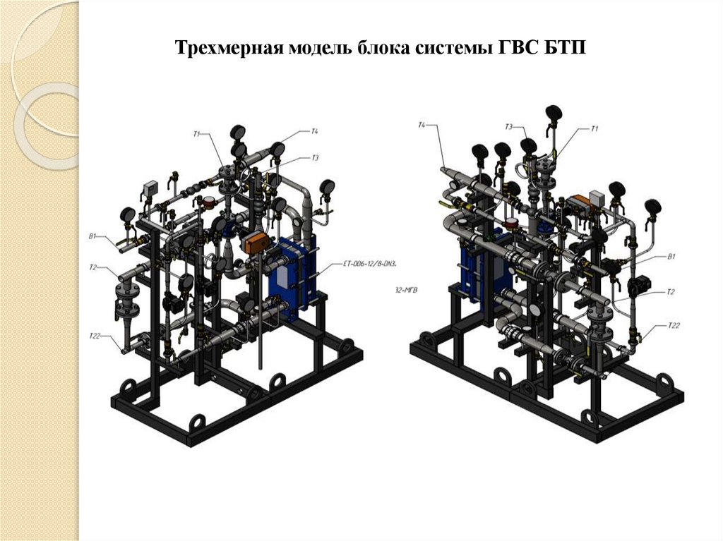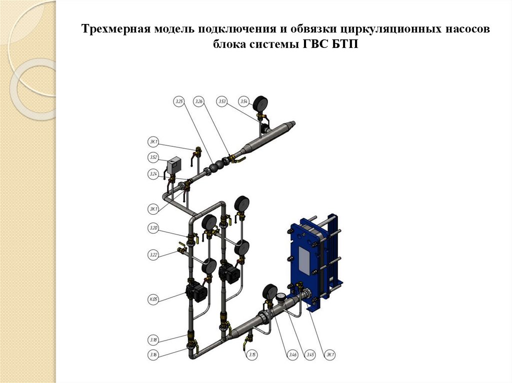 Трехмерная модель подключения и обвязки циркуляционных насосовблока системы ГВС БТП