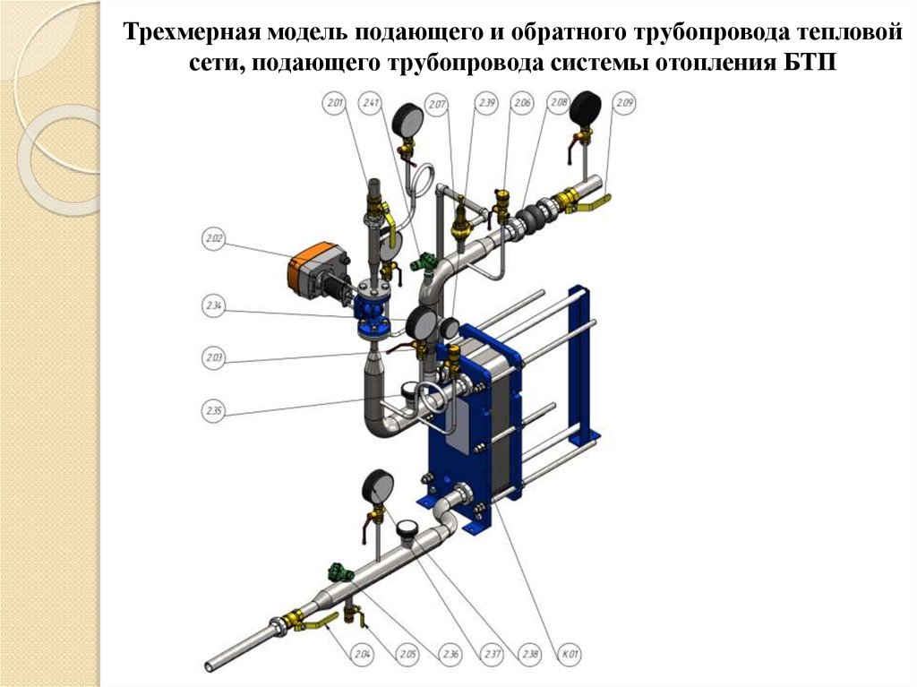 Трехмерная модель подающего и обратного трубопровода тепловойсети, подающего трубопровода системы отопления БТП