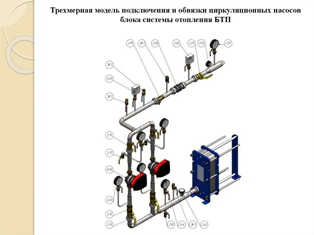 Трехмерная модель подключения и обвязки циркуляционных насосовблока системы отопления БТП