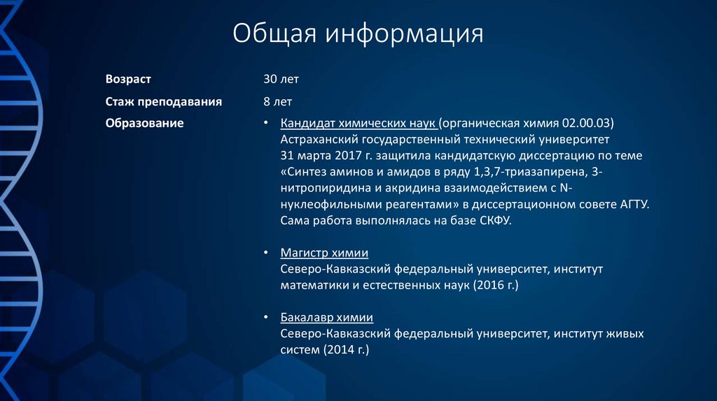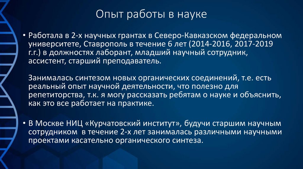 Опыт работы в науке• Работала в 2-х научных грантах в Северо-Кавказском федеральном