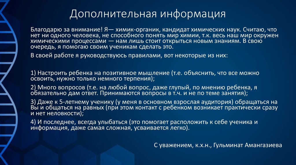 Дополнительная информацияБлагодарю за внимание! Я— химик-органик, кандидат химических наук. Считаю, что