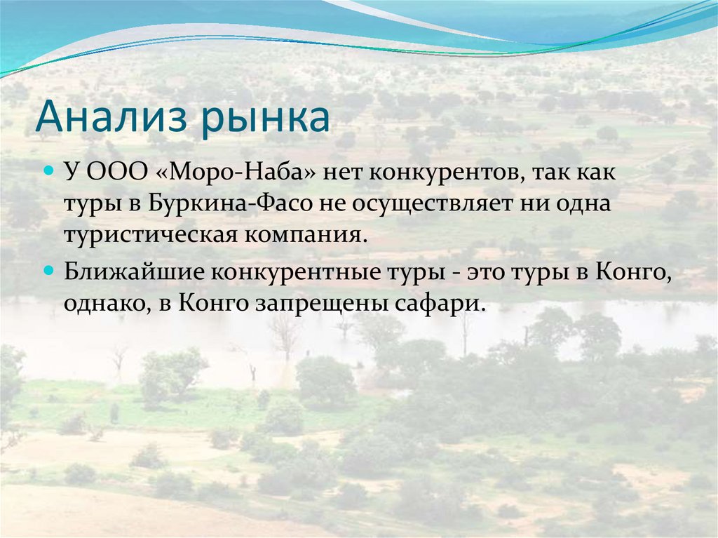 Анализ рынкаУ ООО «Моро-Наба» нет конкурентов, так как