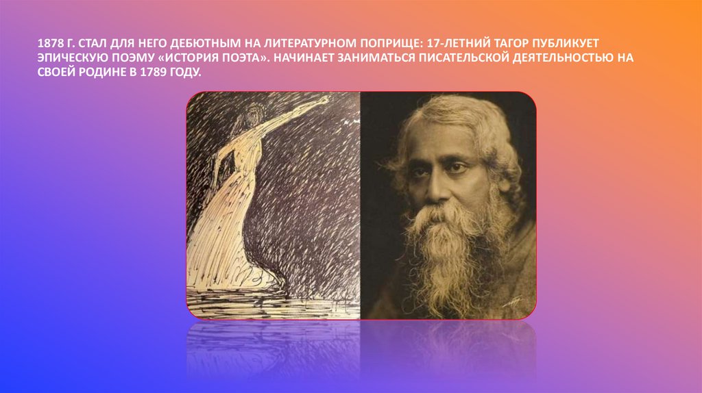 1878 Г. СТАЛ ДЛЯ НЕГО ДЕБЮТНЫМ НА ЛИТЕРАТУРНОМ ПОПРИЩЕ: 17-ЛЕТНИЙ ТАГОР ПУБЛИКУЕТЭПИЧЕСКУЮ ПОЭМУ «ИСТОРИЯ ПОЭТА». НАЧИНАЕТ ЗАНИМАТЬСЯ ПИСАТЕЛЬСКОЙ ДЕЯТЕЛЬНОСТЬЮ НА