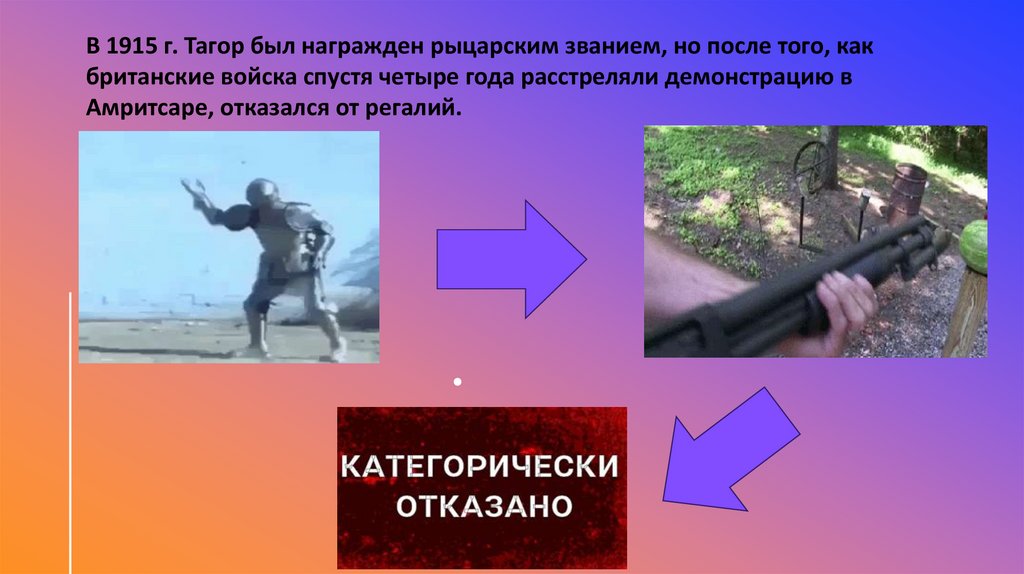 В 1915 г. Тагор был награжден рыцарским званием, но после того, какбританские войска спустя четыре года расстреляли демонстрацию в