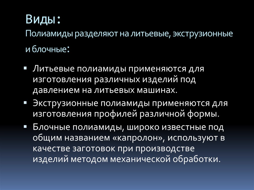 Виды:Полиамиды разделяют на литьевые, экструзионные