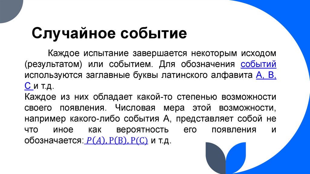 Случайное событиеКаждое испытание завершается некоторым исходом