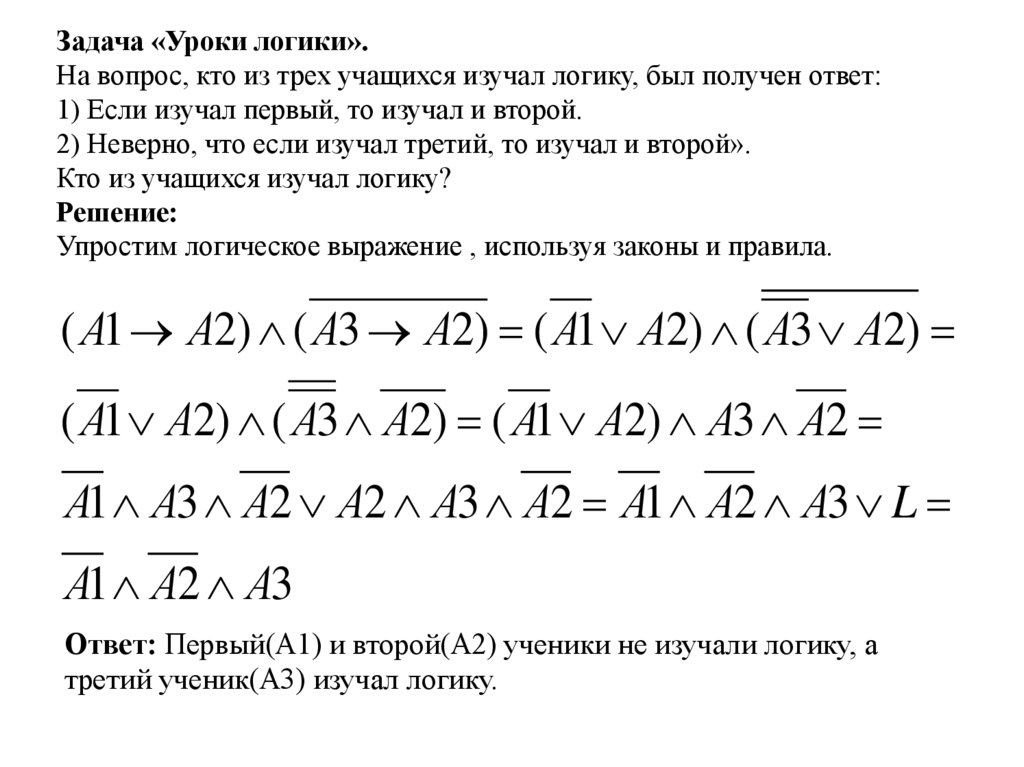 1. Задача «Уроки логики». На вопрос, кто из трех учащихся изучал логику, был получен ответ: 1) Если изучал первый, то изучал и
