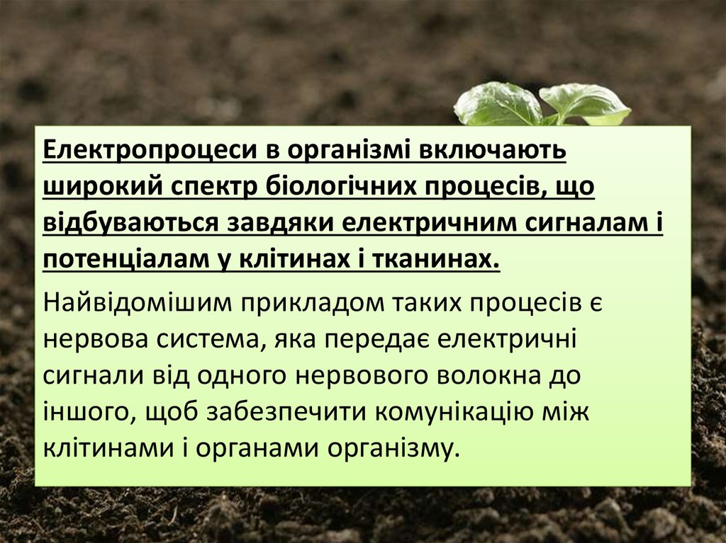 Електропроцеси в організмі включаютьширокий спектр біологічних процесів, що