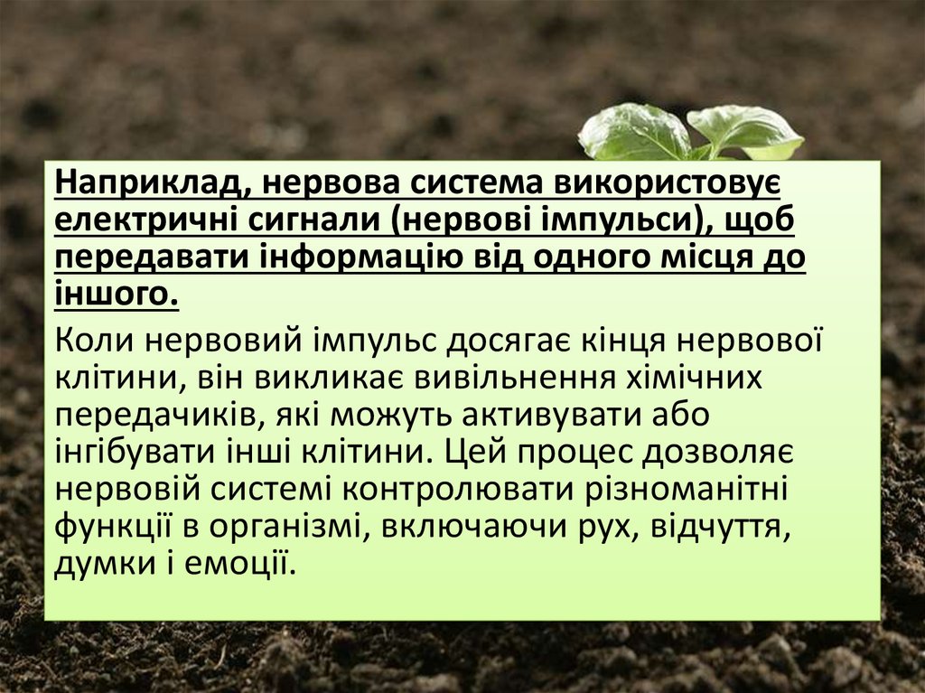 Наприклад, нервова система використовуєелектричні сигнали (нервові імпульси), щоб