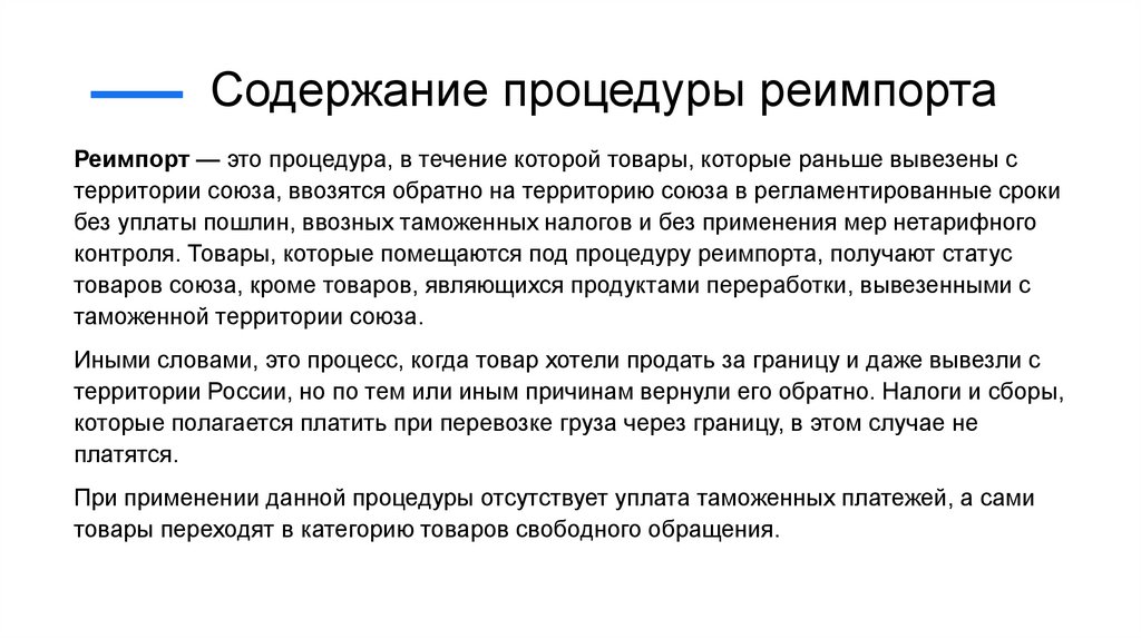 Содержание процедуры реимпортаРеимпорт — это процедура, в течение которой товары, которые раньше вывезены с