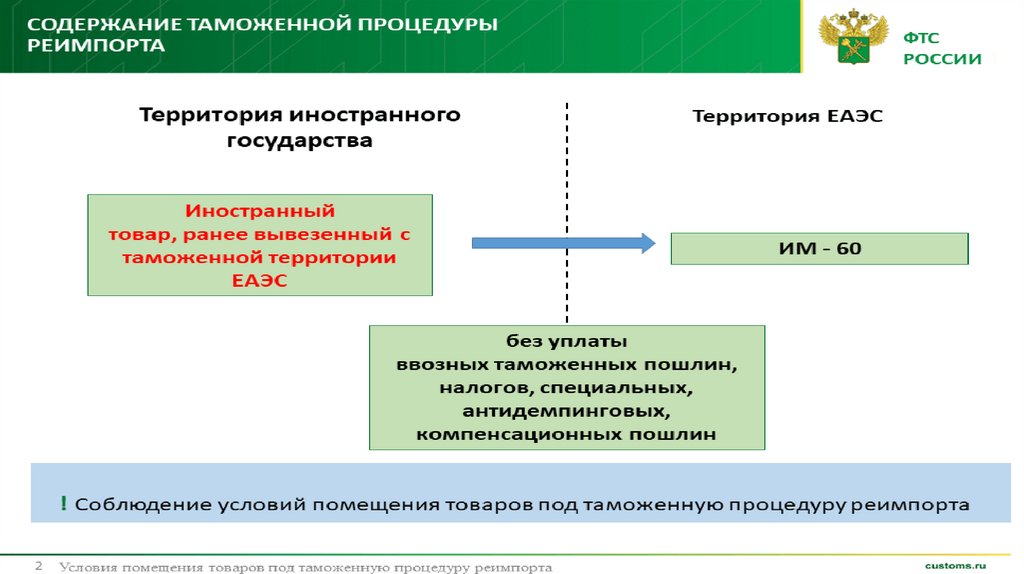 • Товары, помещенные под таможенную процедуру реимпорта, приобретают статус товаров ЕАЭС.