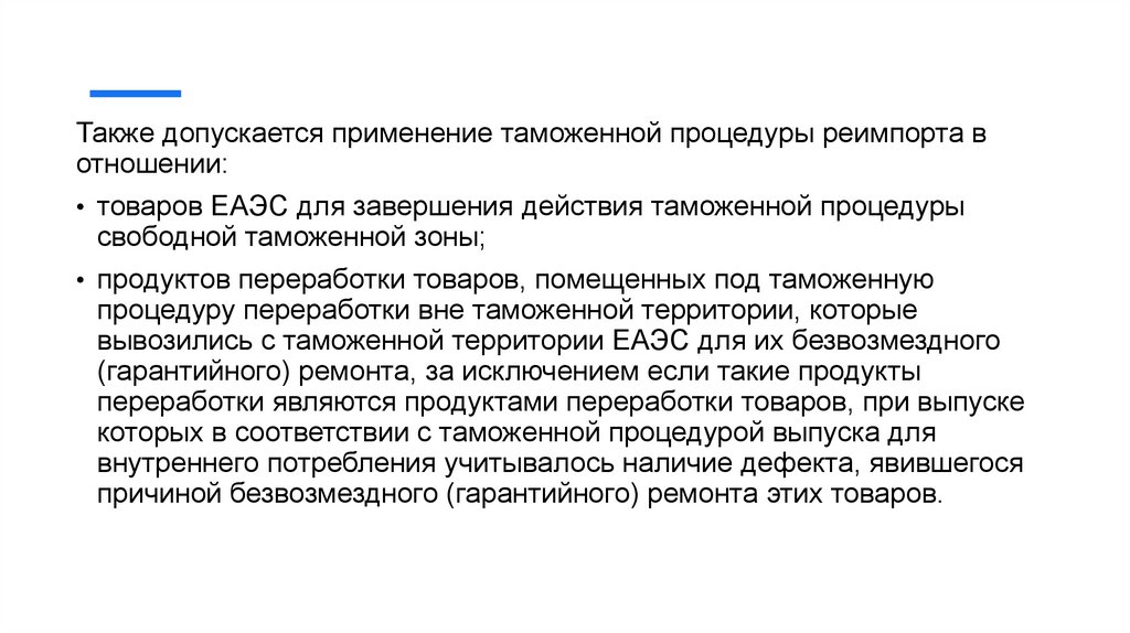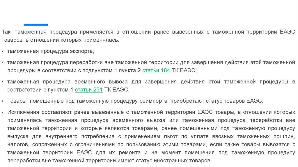Так, таможенная процедура применяется в отношении ранее вывезенных с таможенной территории ЕАЭСтоваров, в отношении которых применялась: