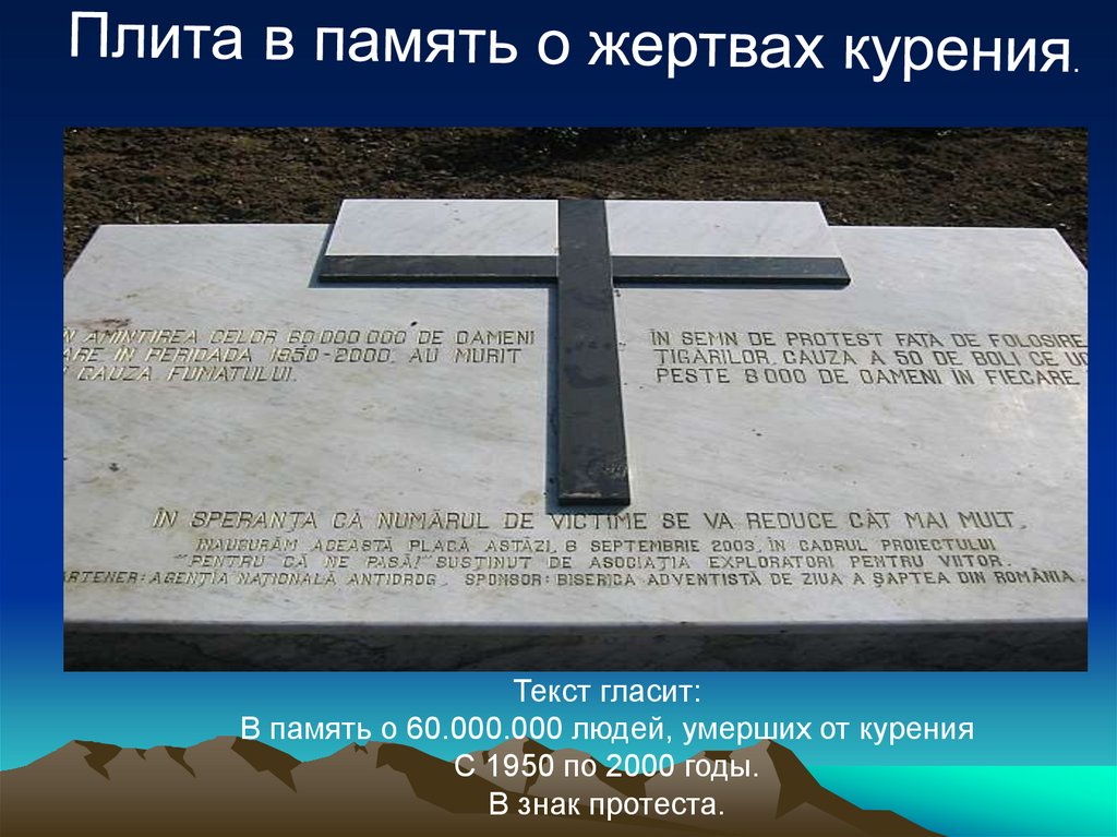 Текст гласит:В память о 60.000.000 людей, умерших от курения