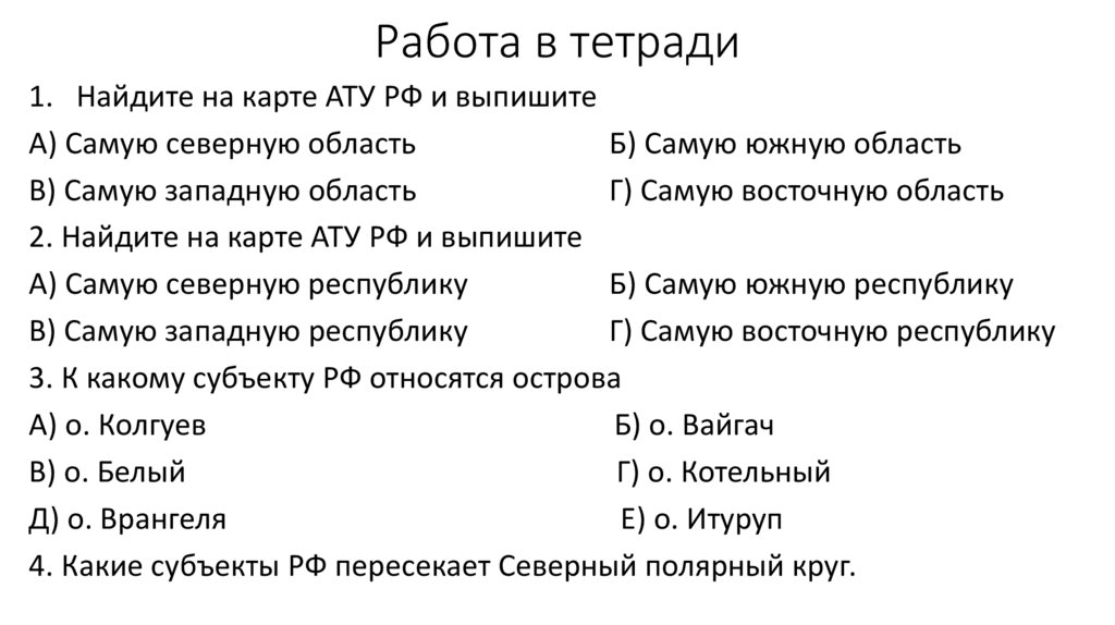 Работа в тетради1. Найдите на карте АТУ РФ и выпишите