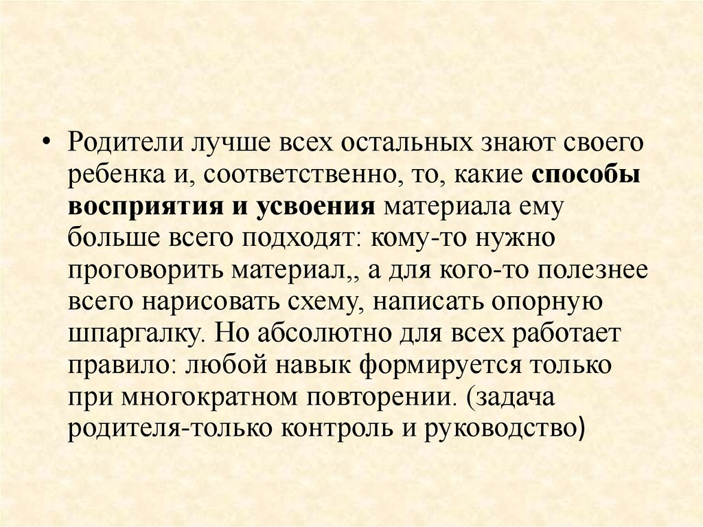 • Родители лучше всех остальных знают своегоребенка и, соответственно, то, какие способы