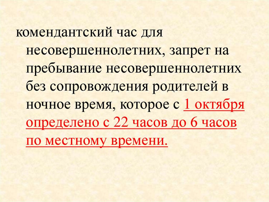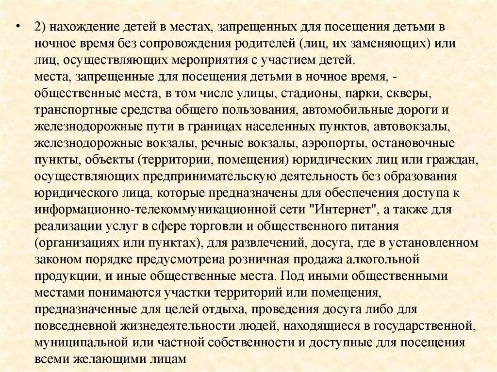 • 2) нахождение детей в местах, запрещенных для посещения детьми вночное время без сопровождения родителей (лиц, их заменяющих) или