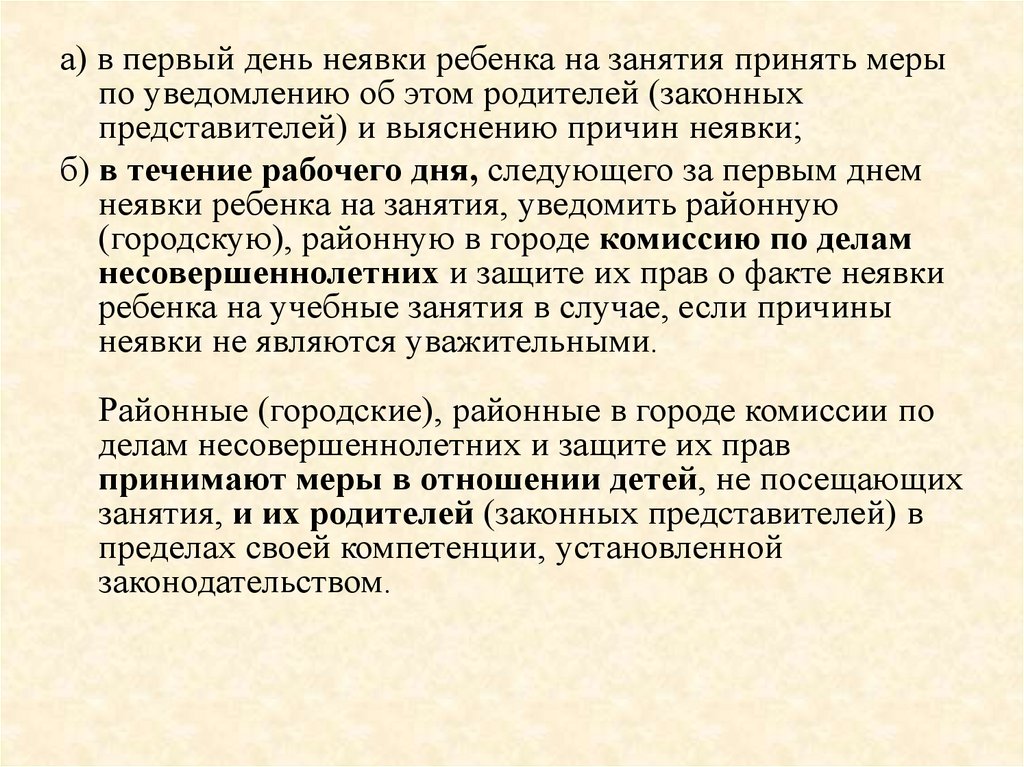 а) в первый день неявки ребенка на занятия принять мерыпо уведомлению об этом родителей (законных