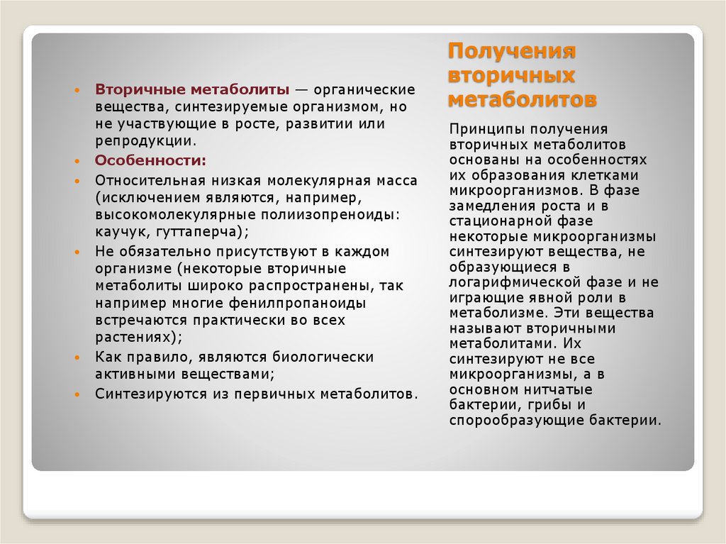 Вторичные метаболиты — органическиевещества, синтезируемые организмом, но