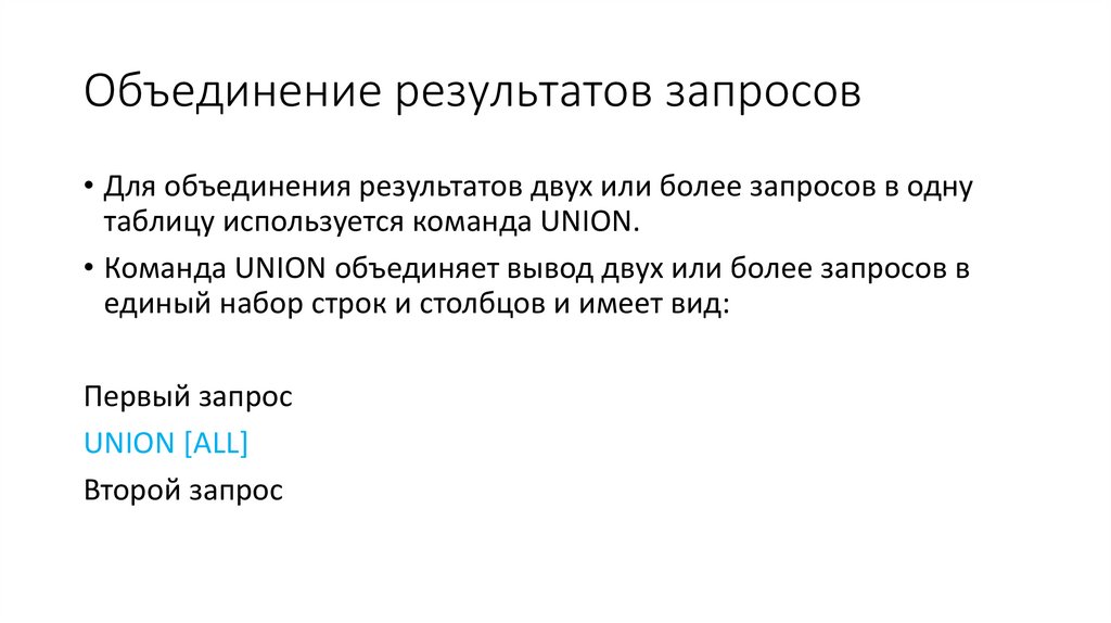 Объединение результатов запросов• Для объединения результатов нескольких запросов с помощью