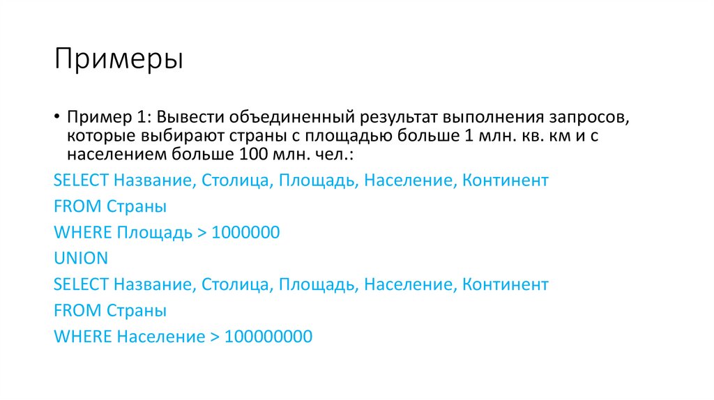 Примеры• Пример 1: Вывести объединенный результат выполнения запросов,