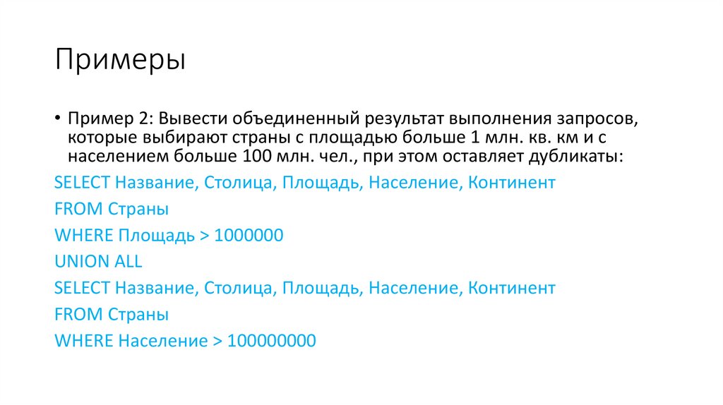 Примеры• Пример 2: Вывести объединенный результат выполнения запросов,
