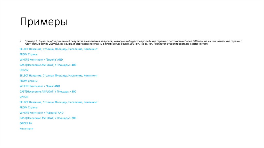 ПримерыПример 3: Вывести объединенный результат выполнения запросов, которые выбирают европейские страны с плотностью более 300 чел. на кв. км, азиатские страны с