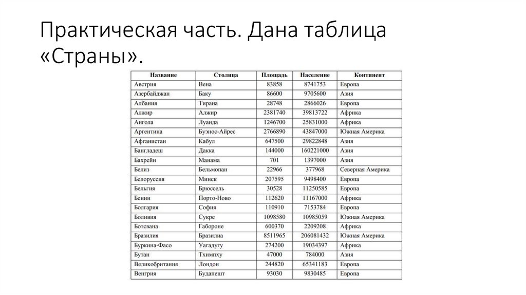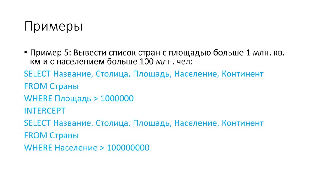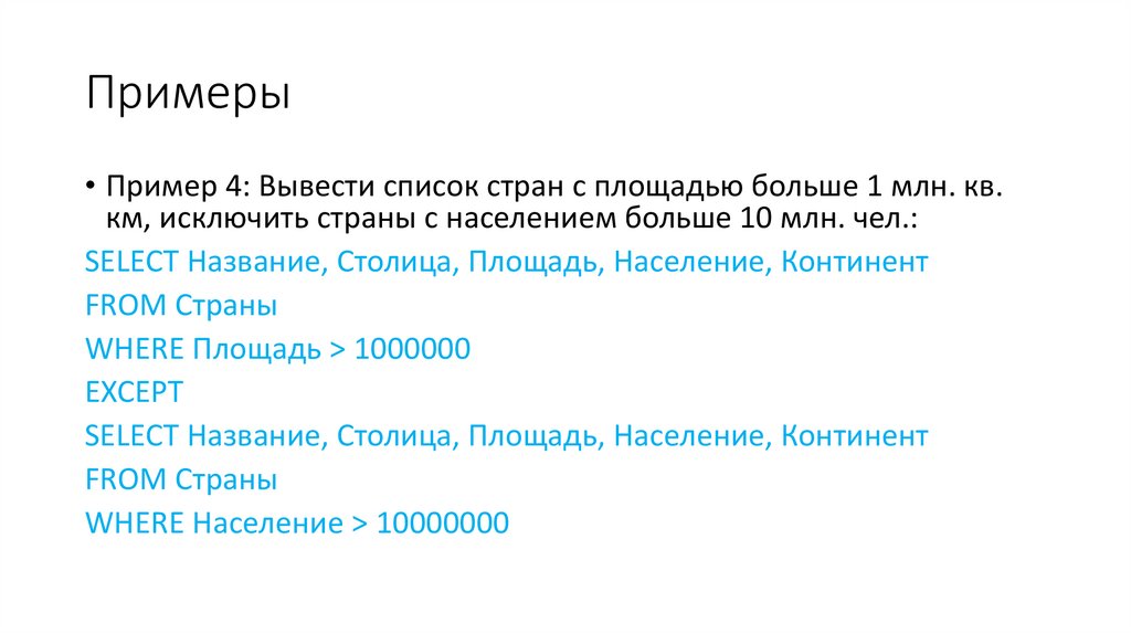 Примеры• Пример 4: Вывести список стран с площадью больше 1 млн. кв.