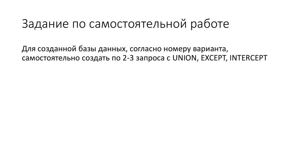 самостоятельно создать по 2-3 запроса с UNION, EXCEPT, INTERCEPT