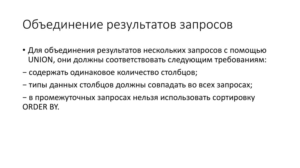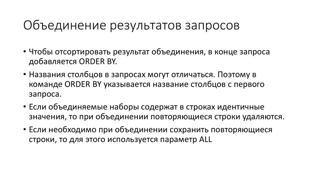 Объединение результатов запросов• Чтобы отсортировать результат объединения, в конце запроса