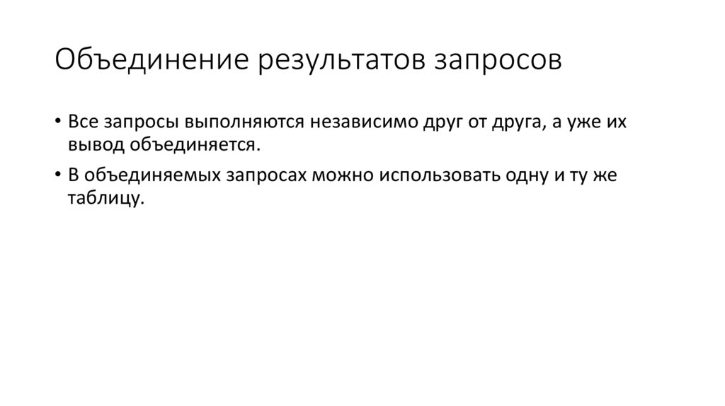 Объединение результатов запросов• Все запросы выполняются независимо друг от друга, а уже их
