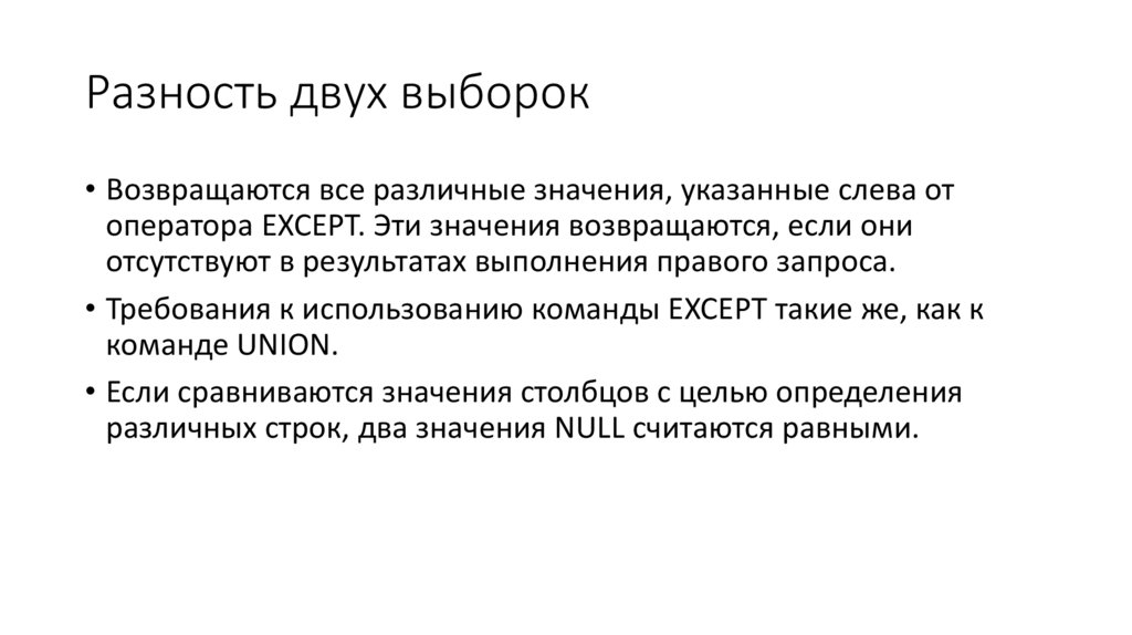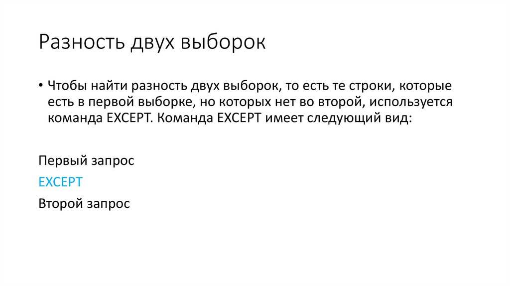 Разность двух выборок• Чтобы найти разность двух выборок, то есть те строки, которые