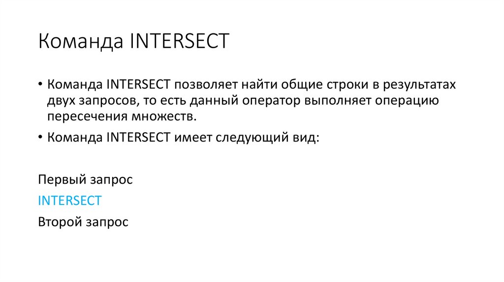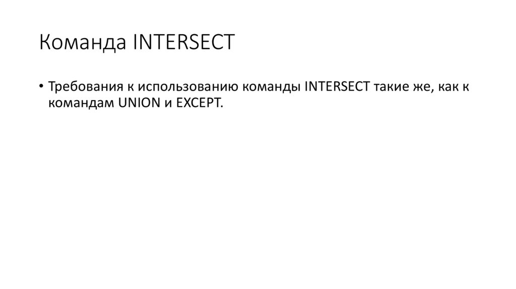 Команда INTERSECT• Требования к использованию команды INTERSECT такие же, как к