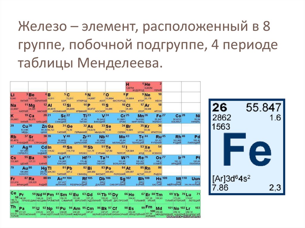 Железо – элемент, расположенный в 8группе, побочной подгруппе, 4 периоде