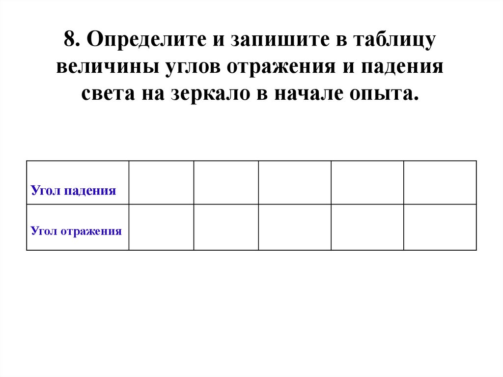 8. Определите и запишите в таблицувеличины углов отражения и падения