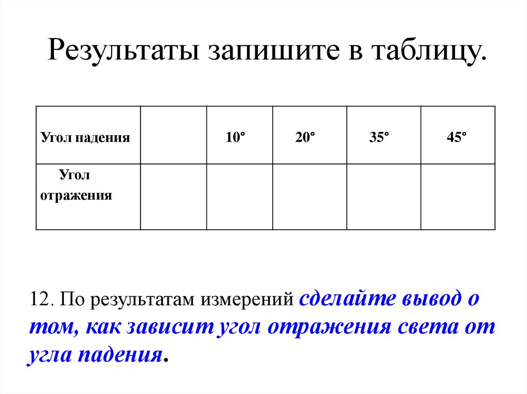 Результаты запишите в таблицу.Угол падения