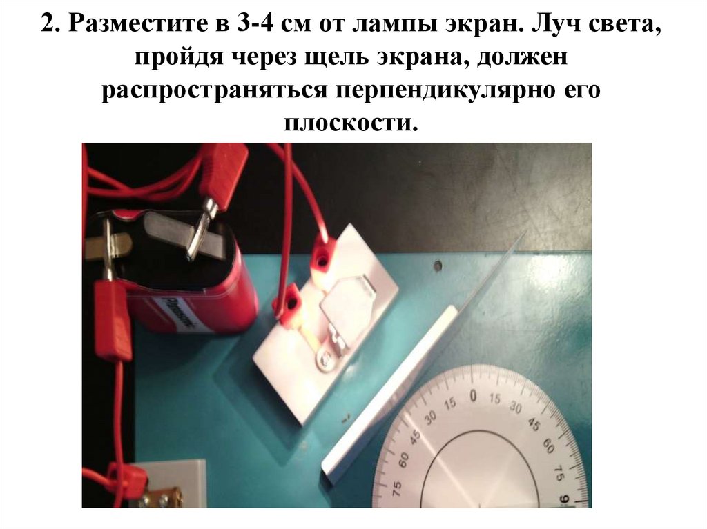 2. Разместите в 3-4 см от лампы экран. Луч света,пройдя через щель экрана, должен