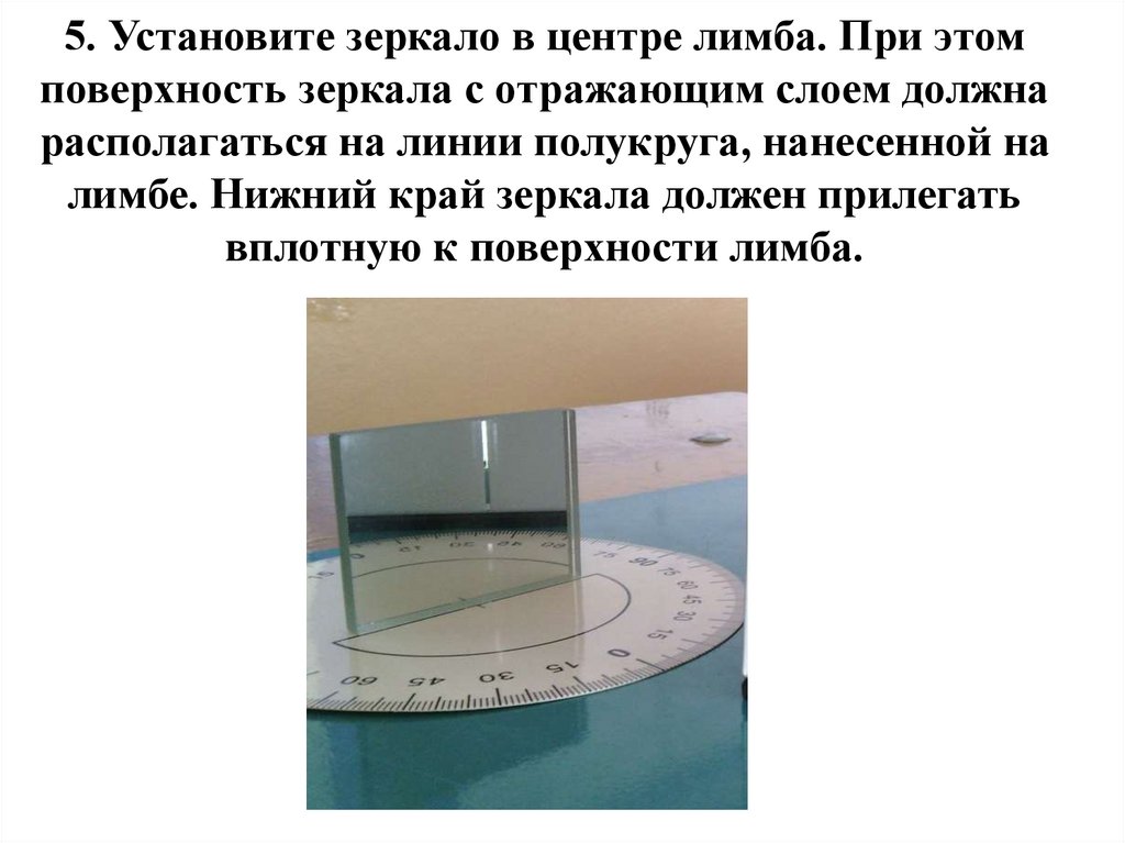5. Установите зеркало в центре лимба. При этомповерхность зеркала с отражающим слоем должна