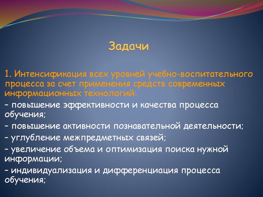 1. Интенсификация всех уровней учебно-воспитательногопроцесса за счет применения средств современных