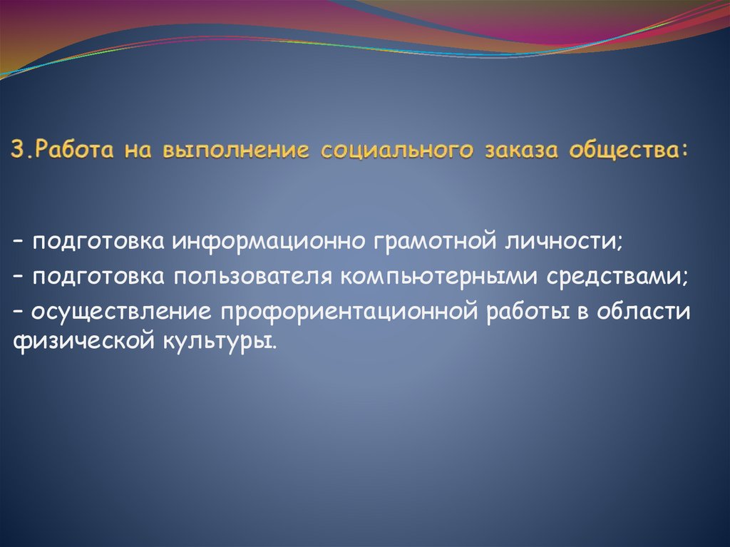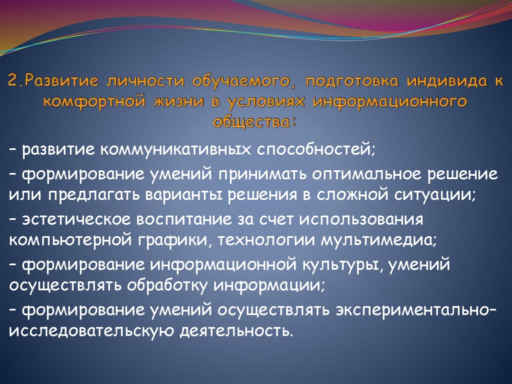 – подготовка информационно грамотной личности;– подготовка пользователя компьютерными средствами;