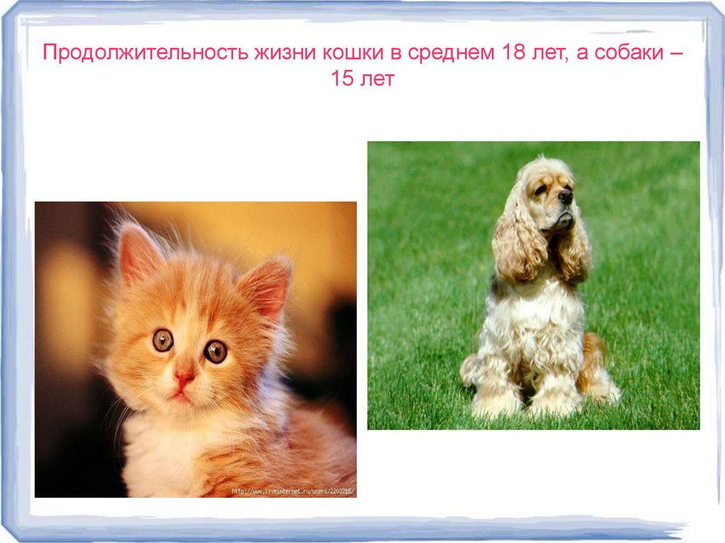 Продолжительность жизни кошки в среднем 18 лет, а собаки –15 лет