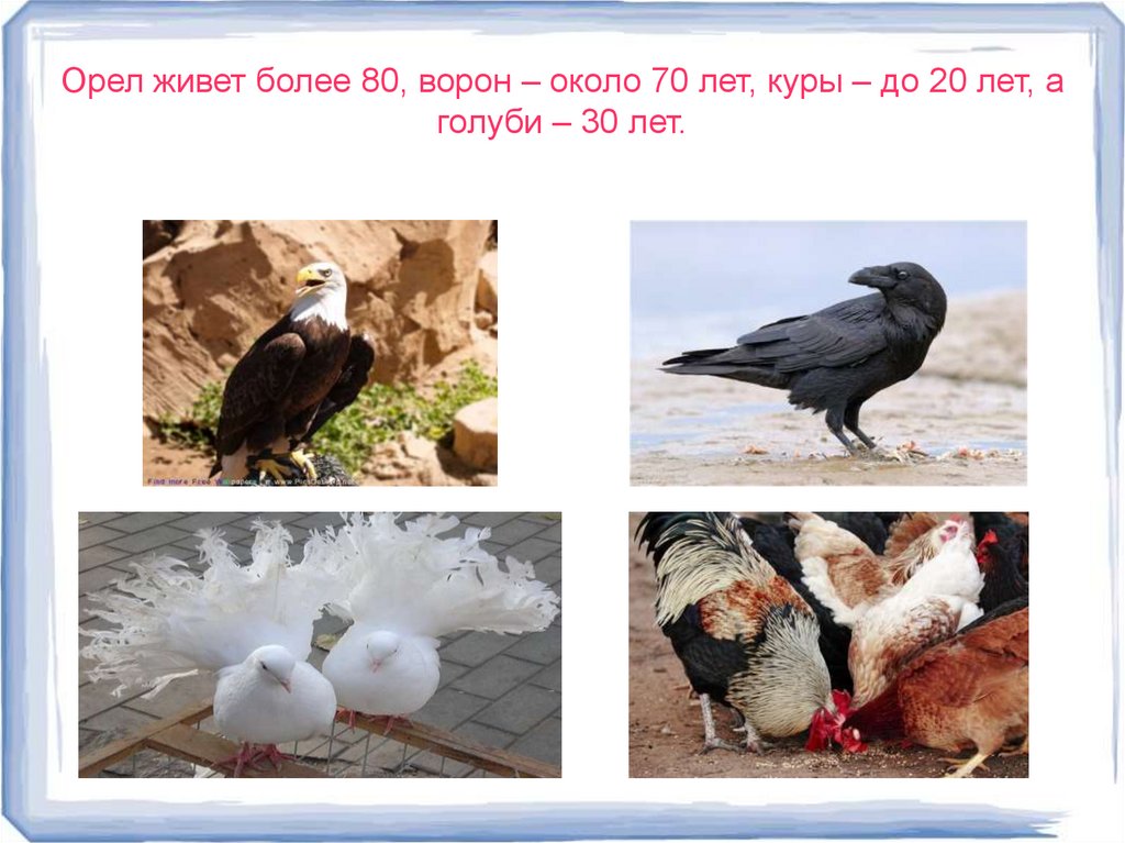 Орел живет более 80, ворон – около 70 лет, куры – до 20 лет, аголуби – 30 лет.