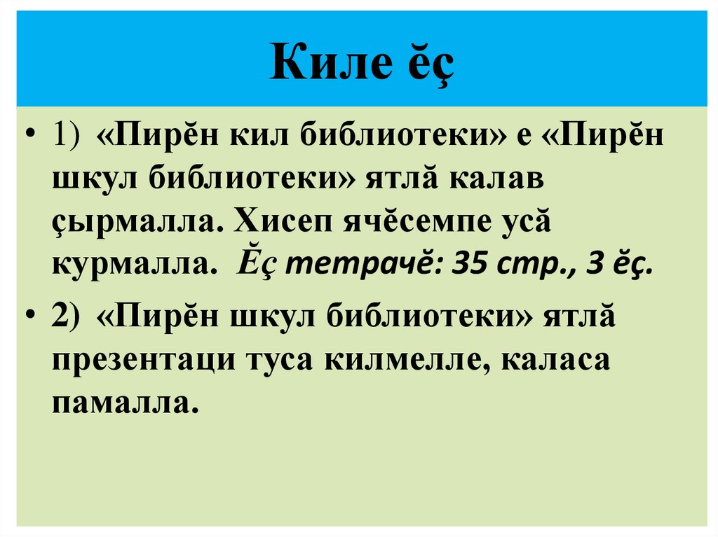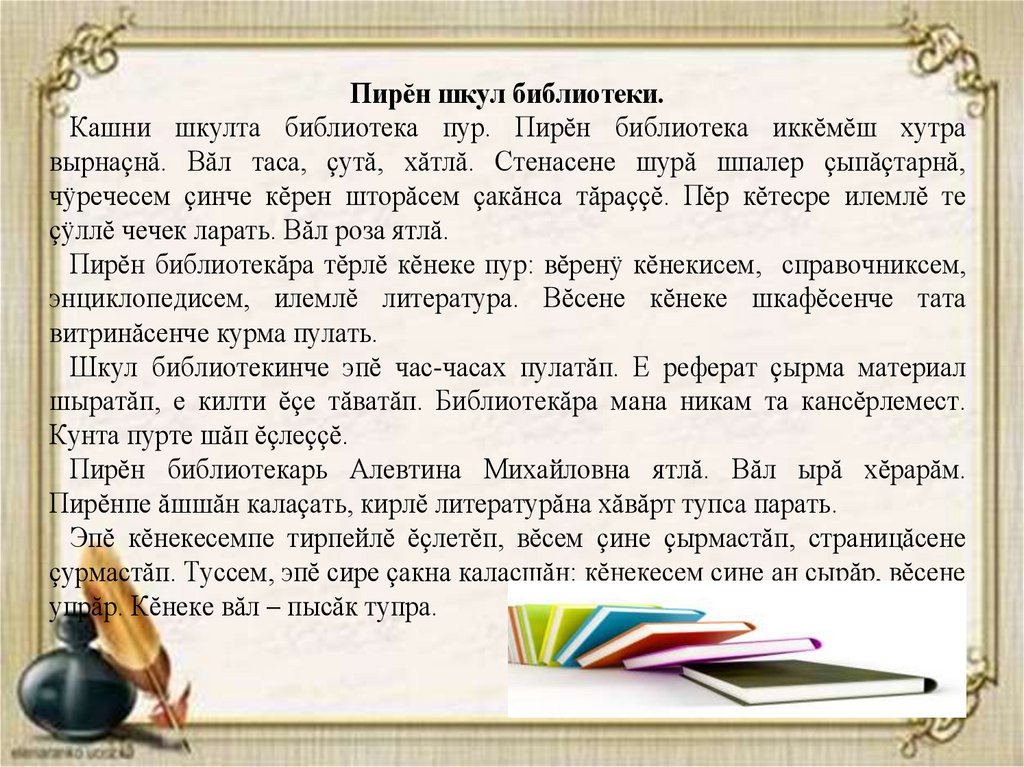 Шкул библиотекинче эпĕ час-часах пулатăп. Е реферат çырма материал