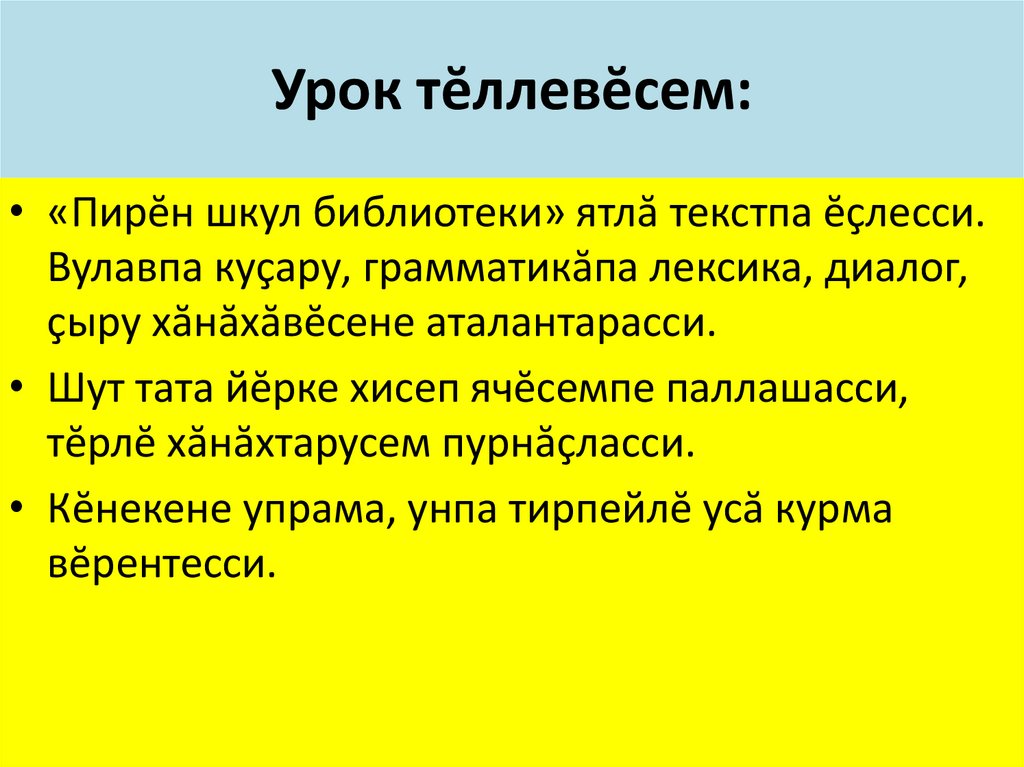Урок тĕллевĕсем:• «Пирĕн шкул библиотеки» ятлă текстпа ĕçлесси.