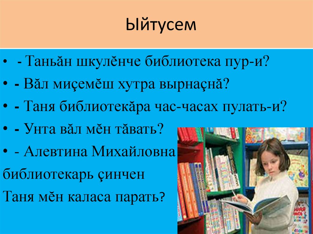 Ыйтусем• - Таньăн шкулĕнче библиотека пур-и?