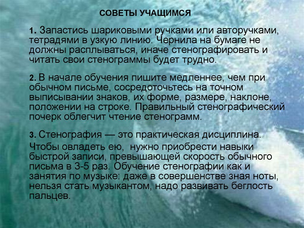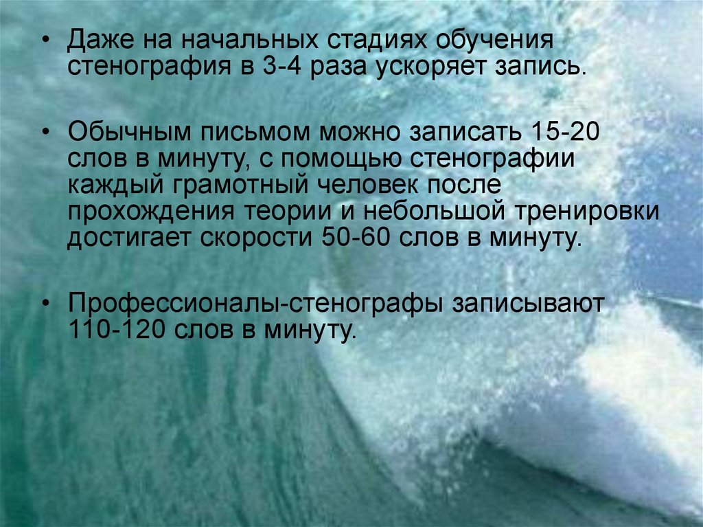 • Даже на начальных стадиях обучениястенография в 3-4 раза ускоряет запись.